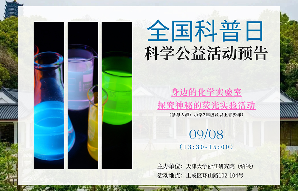 9月15日-25日是全国科普日,为了能够“践行科普为民,共创美好生活”的理念。由天津大学浙江研究院(绍兴)化工科普教育基地发起“身边的化学实验室-探究神秘的荧光”活动!跟着名校学子一起学习化学知识,动手完成实验探索,激发你对科学的好奇心、想象力和探索欲吧!