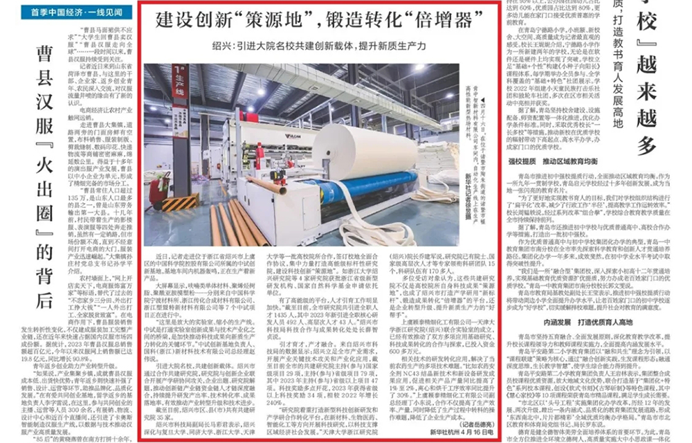 4月18日新华每日电讯刊登题为《建设创新“策源地”,锻造转化“倍增器” 绍兴引进大院名校共建创新载体,提升新质生产力》的报道,以上虞为例,点赞上虞引进大院名校,共建创新载体,通过合作共建研究院,研究院与创新企业联合开展产学研协同攻关,企业出题、研究院解题,推动创新链产业链资金链人才链深度融合,持续提升研发产出率、技术转化率、成果落地率,有效推动产业转型升级和技术进步。