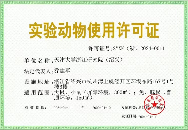 2024年4月11日,天津大学浙江研究院(绍兴)实验动物中心获得由浙江省科学技术厅颁发的《实验动物使用许可证》,是绍兴市第六家拥有开展动物实验条件的研究基地,即日起开始投入使用。