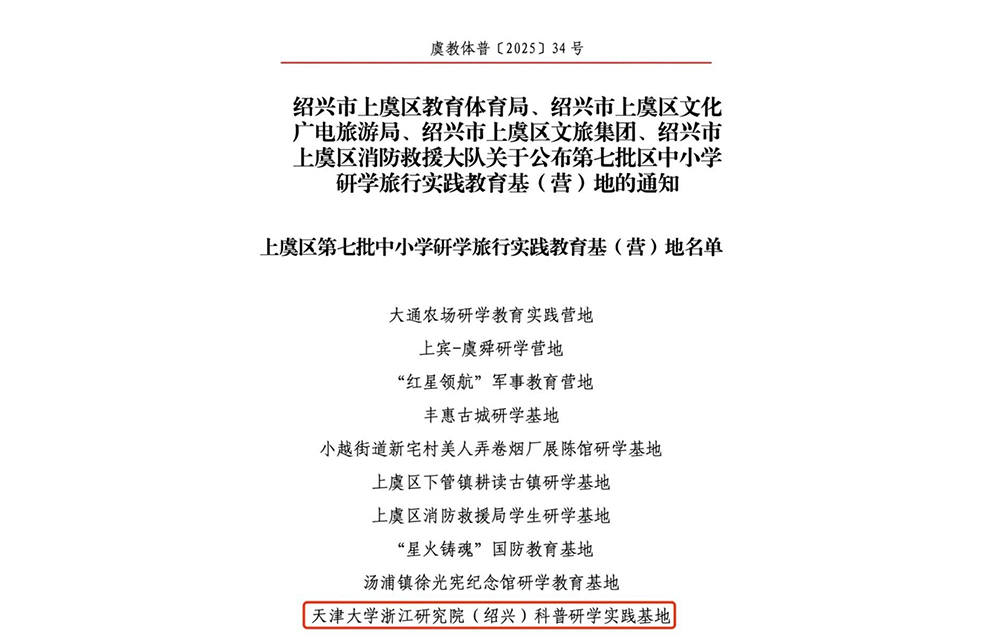 近日,绍兴市上虞区教育体育局、区文化广电旅游局、区文旅集团、区消防救援大队联合发布了《关于公布第七批中小学研学旅行实践教育基(营)地的通知》,天津大学浙江研究院(绍兴)化工科普教育基地成功入选,正式成为上虞区中小学生研学实践教育基(营)地之一!